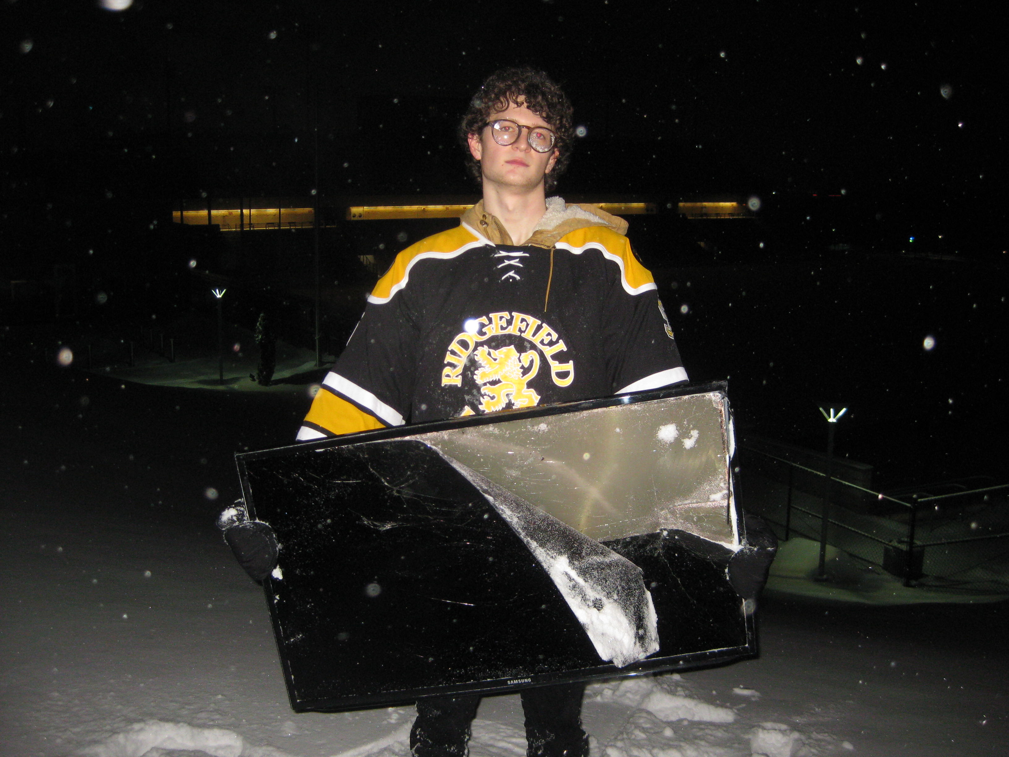 Arthur with our tech dump TV. It did NOT make a good sled (We cleaned up everything)